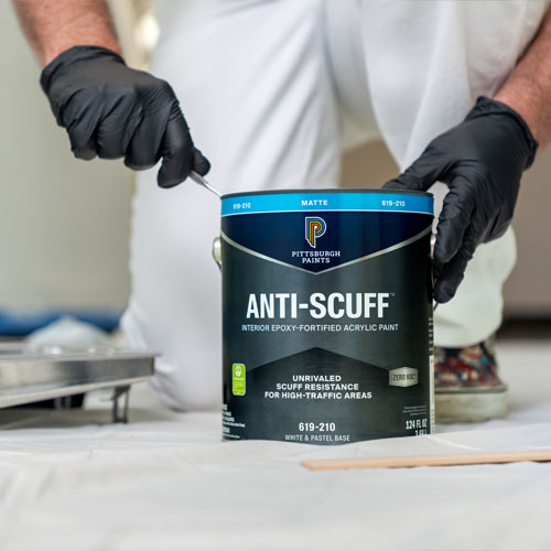 Pittsburgh Paints Anti-Scuff Interior Zero VOC^ paint delivers unrivaled scuff resistance across all sheens and tint bases, making it ideal for high-traffic areas in both commercial and residential spaces. Anti-Scuff provides a smooth application and finish, as well as high-hiding, great coverage, and excellent touch-up. It is recommended for: hallways, stairwells, offices, lobbies, restrooms, waiting rooms, fitting rooms, locker rooms, gymnasiums, fitness centers, service entrances, and more.